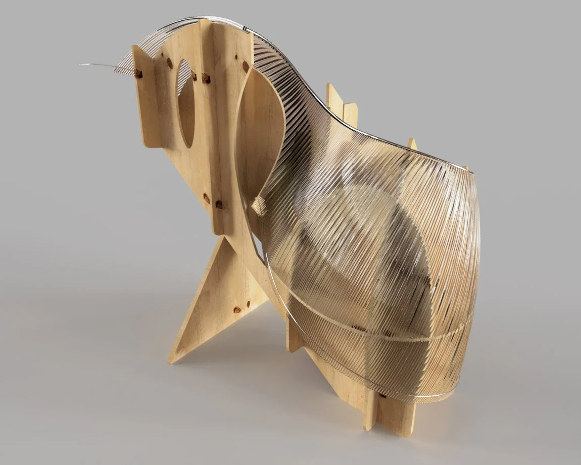 The problem we kept running into, as we tried to scale up from pieces the size of cars to pieces the size of trees, was that stiffness becomes the enemy. Elements that large, held rigid, are prone to fail catastrophically. So we went in the other direction: rather than fighting for rigidity, we designed in flexibility. Smaller elements that can shift relative to one another, conceived as part of a coherent whole. The analogy I keep coming back to is a sushi mat — made entirely of individual sticks of bamboo, yet when you look at it, you see one thing. It has flexibility and integrity at the same time. That approach has become fundamental to how we work.